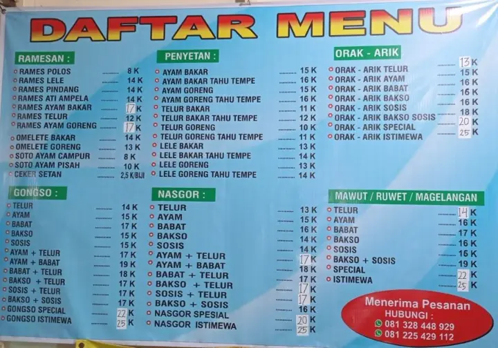 Bahkan, menu makanan termahal di sini hanya dihargai 25 ribu rupiah, seperti gongso istimewa, nasi goreng istimewa, dan nasi ruwet / magelangan istimewa. Semua menu ini dilengkapi dengan topping seperti telur, ayam, babat, bakso, dan sosis yang bisa disesuaikan dengan selera masing-masing.
